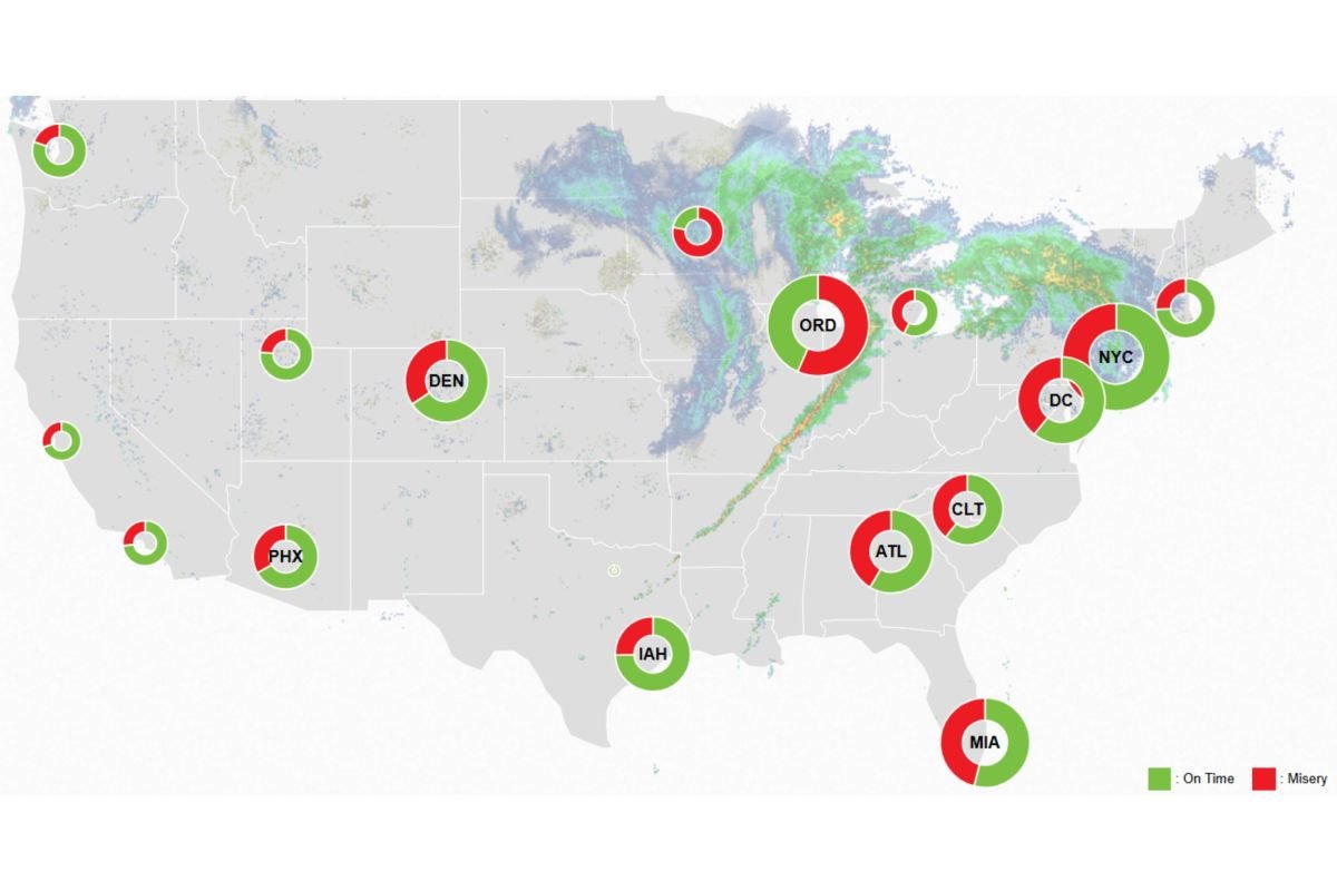 Viene visualizzata la mappa della miseria di FlightAware quanti ritardi e cancellazioni si verificano in diversi momenti della giornata, utilizzando una finestra di quattro ore.