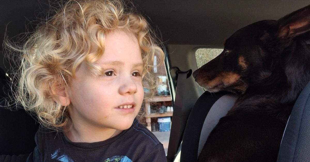 La nuova foto pubblicata di Gus mostra il bambino di quattro anni nel retro dell’auto accanto a un cane da bestiame.
