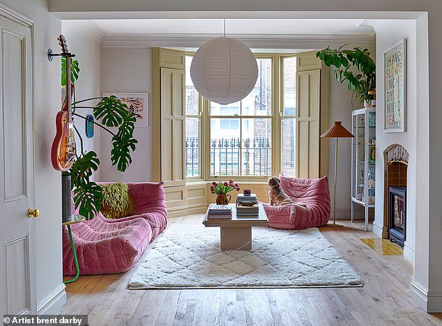 Il soggiorno è un santuario per Lisa e Buddy (il cane, nella foto) ed è stato precedentemente utilizzato da un vincitore di MasterChef per ospitare supperclub. Il divano e la poltrona Togo sono di Ligne Roset e accompagnano Lisa da otto anni. Il tavolino è stato trovato su Ebay e il tappeto è La Redoute. La pavimentazione è di Parador.