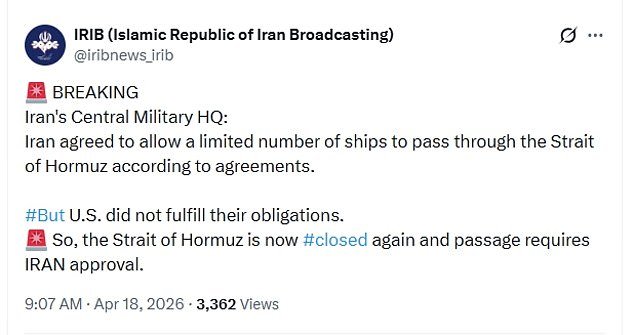 L’emittente statale IRIB ha citato il quartier generale militare centrale dell’Iran affermando che il corso d’acqua è stato nuovamente chiuso dopo che Washington “non ha adempiuto ai propri obblighi”, aggiungendo che il passaggio ora richiederebbe l’approvazione iraniana.
