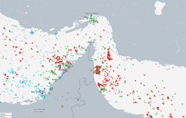 Un timelapse del traffico marittimo attraverso lo Stretto di Hormuz mostra un calo significativo tra sabato e domenica, sebbene non sia totale. Almeno una nave cisterna per gas di petrolio liquefatto è stata vista transitare lungo la rotta domenica mattina presto.