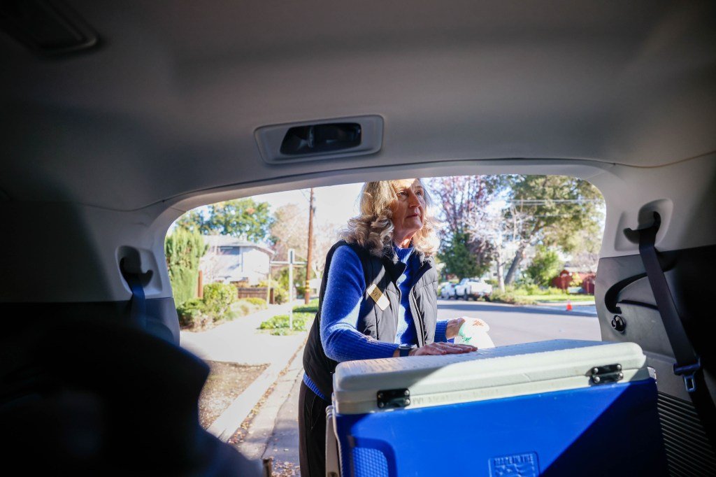 Stephanie Figeira, direttrice dei servizi nutrizionali del programma, è stata accolta da Larry Dahl, 74 anni. Riceve i pasti il martedì e il giovedì. Un tempo frequentatore abituale del campus della Stanford University, Dahl ora trascorre la maggior parte del tempo da solo a casa a causa della fragilità delle ossa.