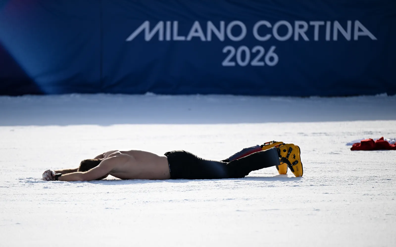 Anche se potrebbe essere la fine per l’austriaco, è uscito per la sua strada, a faccia in giù e a torso nudo nella neve, circondato da una folla ruggente.