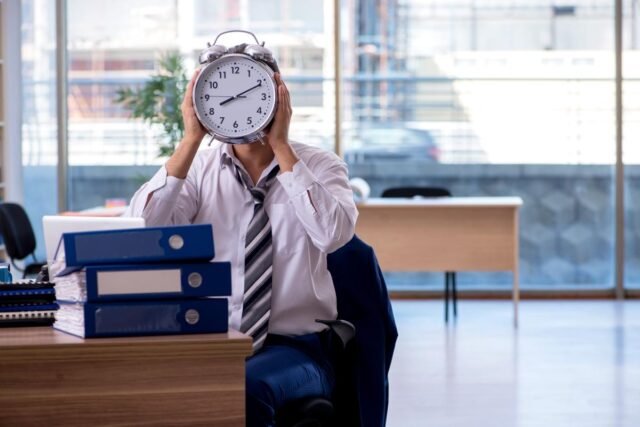 Un dipendente seduto alla scrivania con la testa dietro una sveglia, con pile di raccoglitori e documenti accanto a lui, indicando lavoro e stress eccessivi.