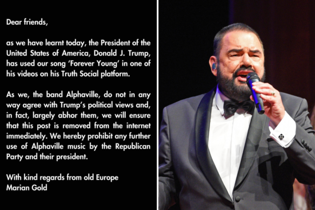 La band ha aggiunto: “Con la presente proibiamo qualsiasi ulteriore utilizzo della musica degli Alphaville da parte del Partito Repubblicano e del suo presidente”.