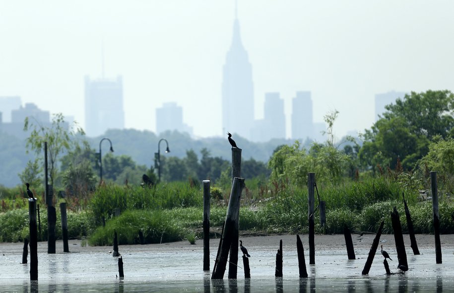 L'erba alta in una palude del Liberty State Park ondeggia nel vento, lunedì 11 maggio 2020, a Jersey City, NJ (AP Photo/Mark Lennihan)