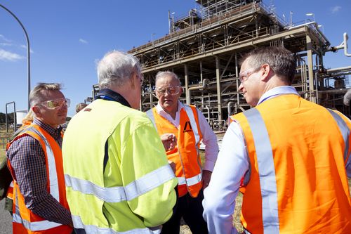 Il primo ministro Anthony Albanese e il ministro per i cambiamenti climatici e l’energia Chris Bowen durante una visita alla raffineria di petrolio Ampol Lytton a Brisbane il 9 aprile 2026. (Dominic Lorrimer)