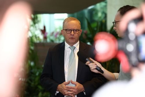 Il primo ministro Anthony Albanese durante un’intervista alla porta dopo l’atterraggio a Singapore il 10 aprile 2026. (Dominic Lorrimer)