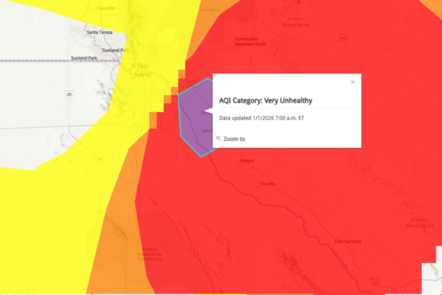 Nelle prime ore di giovedì, le aree circostanti Socorro e San Elizario, in Texas, hanno riportato livelli di inquinamento da particelle fini (PM2.5) nell’intervallo “molto malsano”, secondo AirNow, una risorsa gestita dall’Environmental Protection Agency (EPA), National Oceanic and Atmospheric Administration (NOAA) e altre agenzie.