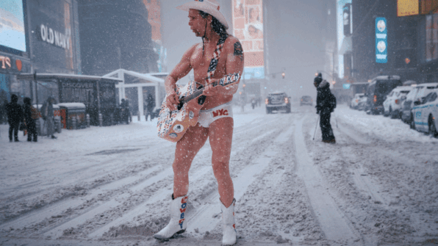 I Naked Cowboy si esibiscono sotto la neve a Times Square a New York.Immagini Getty