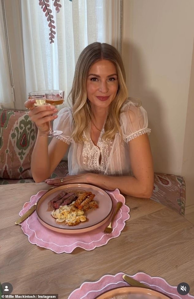 Portandosi su Instagram, Millie era stupenda vestita di bianco puro camicetta e gonna di raso bianco mentre serviva bistecca, carote calde all’acero e patate dauphinoise al tartufo.