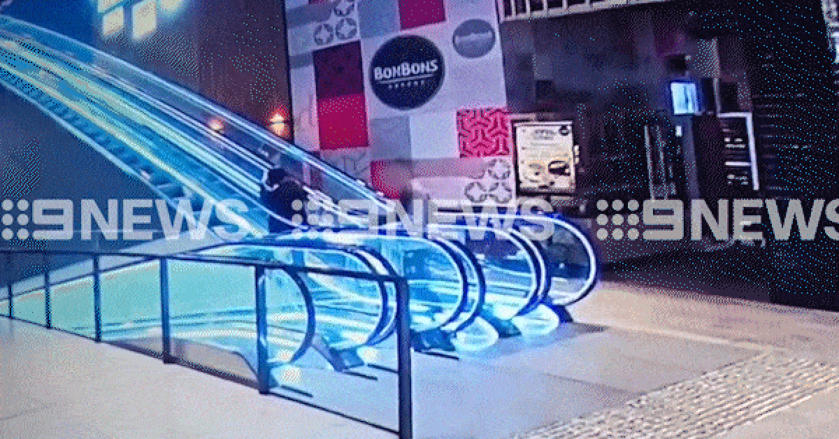 Le riprese della CCTV mostrano la donna di 25 anni di Mount Waverley che cammina per il centro, quando un uomo appare da dietro un muro e la segue su una scala mobile.