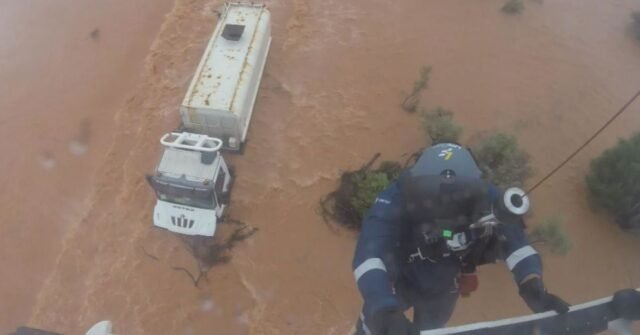 Un membro dell’equipaggio era abbassato con il verricello, in equilibrio sul tetto della cabina mentre l’autista si aggrappava.