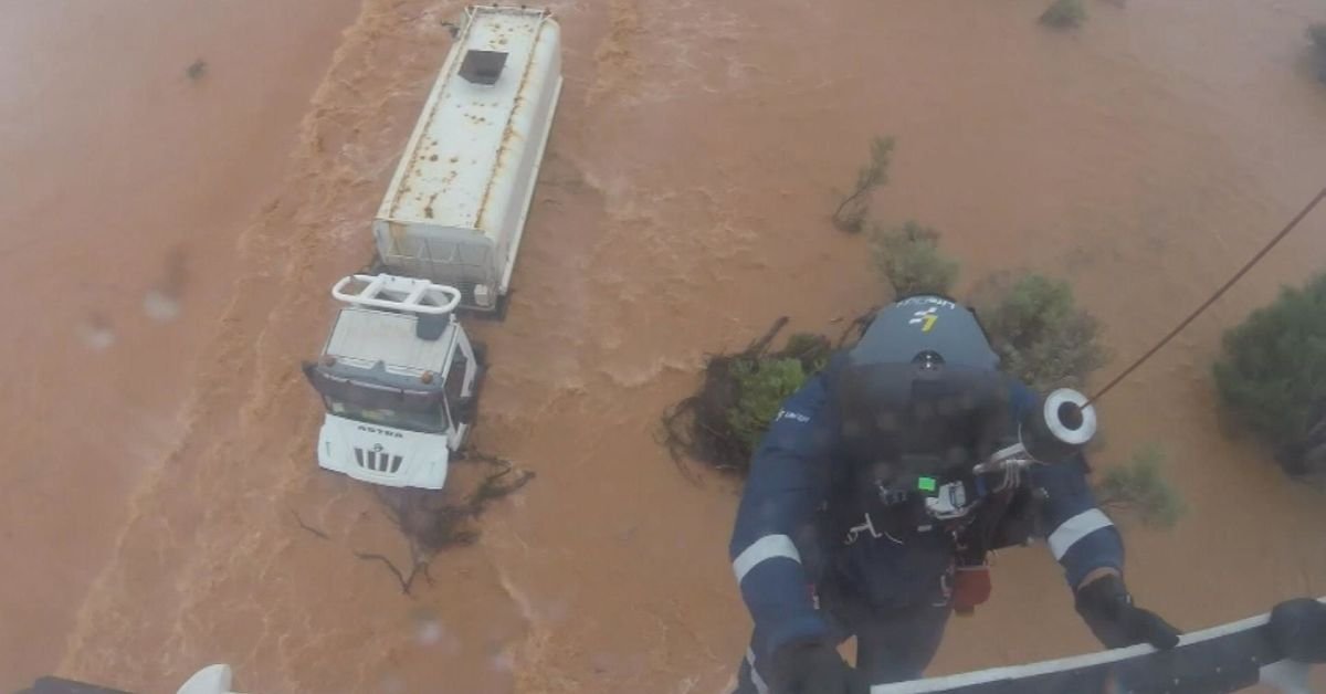 Un camionista è stato portato in salvo dalla sua cabina mentre le acque alluvionali hanno inghiottito il veicolo a sud-ovest di Broken Hill.