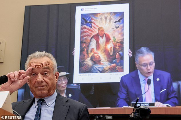 Il segretario dell’UHealth and Human Services (HHS) Robert F. Kennedy Jr. ascolta mentre il rappresentante Mark Takano (D-CA) presenta un’immagine AI pubblicata dal presidente degli Stati Uniti Donald Trump che raffigura se stesso come una figura simile a Gesù, che secondo il presidente Trump lo mostrava come un professionista medico