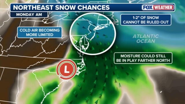 Si prevede che la neve diminuirà all’inizio di lunedì man mano che la bassa costa si approfondirà e uscirà dal nord-est. Entro lunedì pomeriggio dovrebbe ritornare il sole.