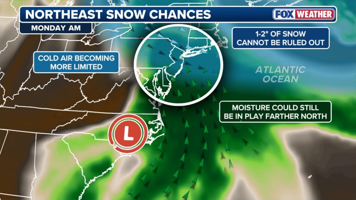 Un sistema di tracciamento in via di sviluppo vicino alla costa potrebbe portare neve durante la notte e raffiche di vento nell’area dei tre stati prima del tragitto giornaliero di lunedì mattina. FOX 5 NY