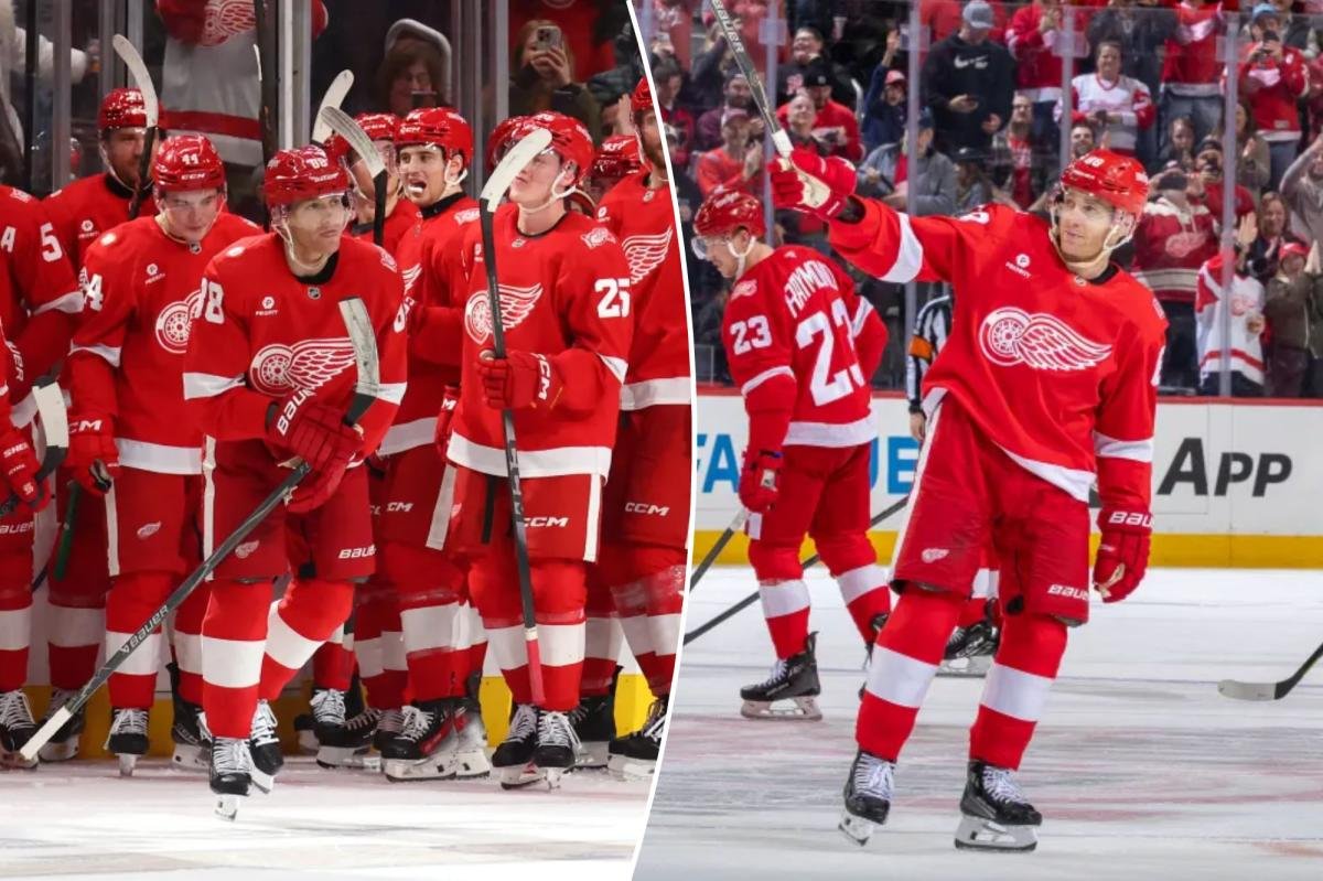 Patrick Kane saluta i tifosi dopo aver segnato il suo 500esimo gol in NHL nella schiacciante vittoria per 5-1 dei Red Wings sui Canucks l’8 gennaio 2026 a Detroit. . NHLI tramite Getty Images