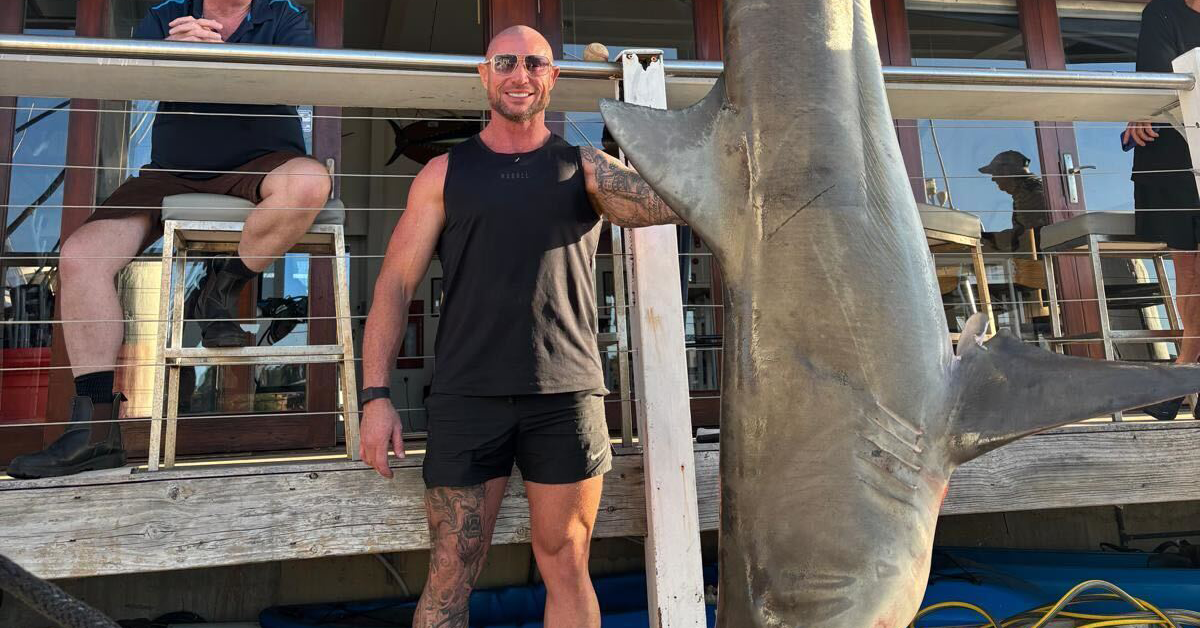 A circa 20 metri d’acqua, e lontano dalle spiagge balneabili, Allchin e l’equipaggio della barca hanno agganciato lo squalo e lo hanno portato a bordo.