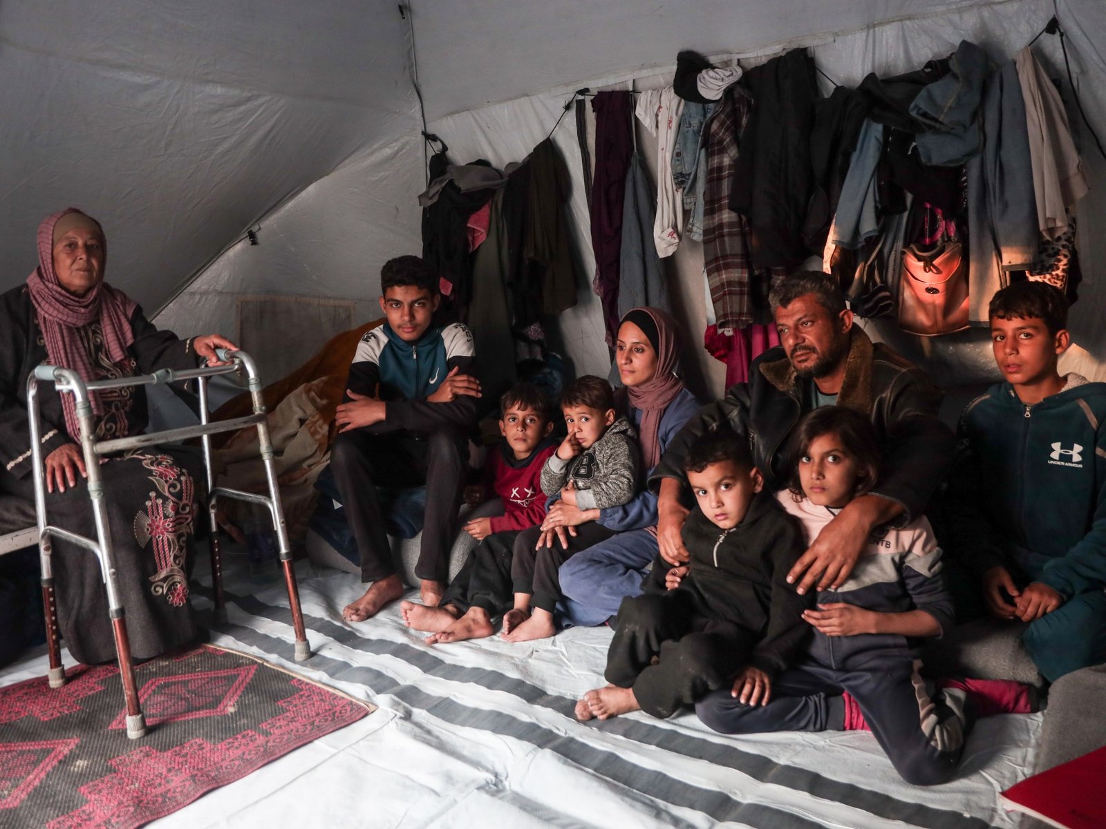Gaza City- Stipati in una minuscola tenda in una scuola gestita dalle Nazioni Unite nel centro di Gaza City, Alaa Alzanin, insieme a sua moglie, cinque figli, la madre di 71 anni e la sorella minore, stanno cercando rifugio dopo aver perso la casa a Beit Hanoon durante la guerra in Israele. Sono stati sfollati otto volte e in questa tenda ora si proteggono dalla pioggia e dal freddo invernale.