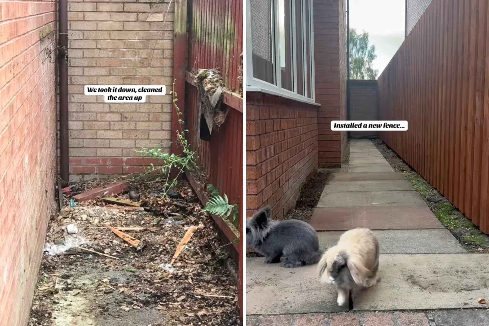 Viene mostrato il clip successivo il canile demolito, con l’area sgombrata e ripulita. Da lì, la trasformazione accelera: viene installata una nuova recinzione, seguita da filmati due conigli—Cici e Jack Jack—esplorano ciò che il creatore descrive come il loro “lunghezza di 24 piedi capannone per conigli.