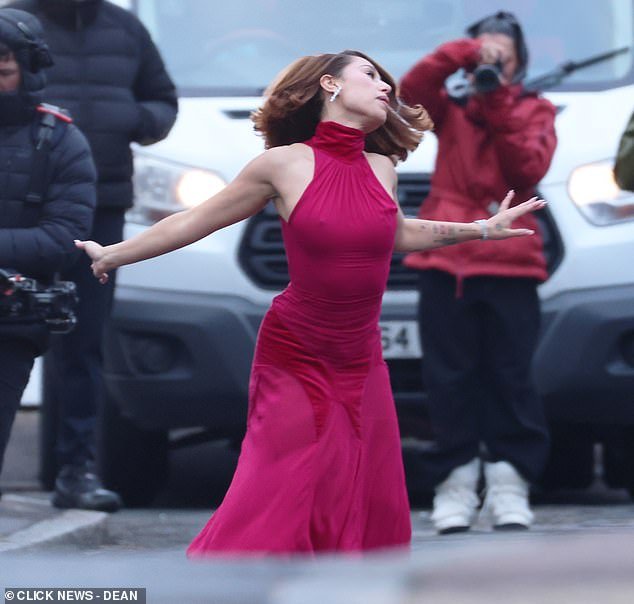 Raye, 28 anni, volteggiava vigorosamente in un vestito rosa acceso mentre chiudeva la zona est di Londra per filmare un nuovo emozionante video musicale martedì