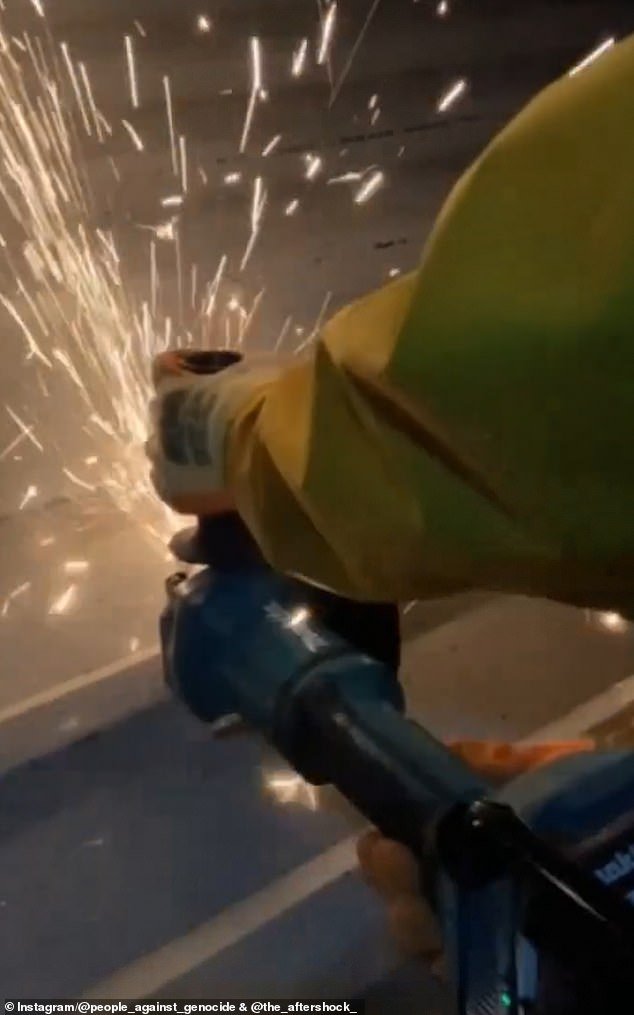 Si dice che i membri di un gruppo noto come People Against Genocide abbiano poi scalato l’edificio prima di vandalizzarlo e attaccarlo con seghe elettriche (nella foto, in un filmato girato dagli attivisti)