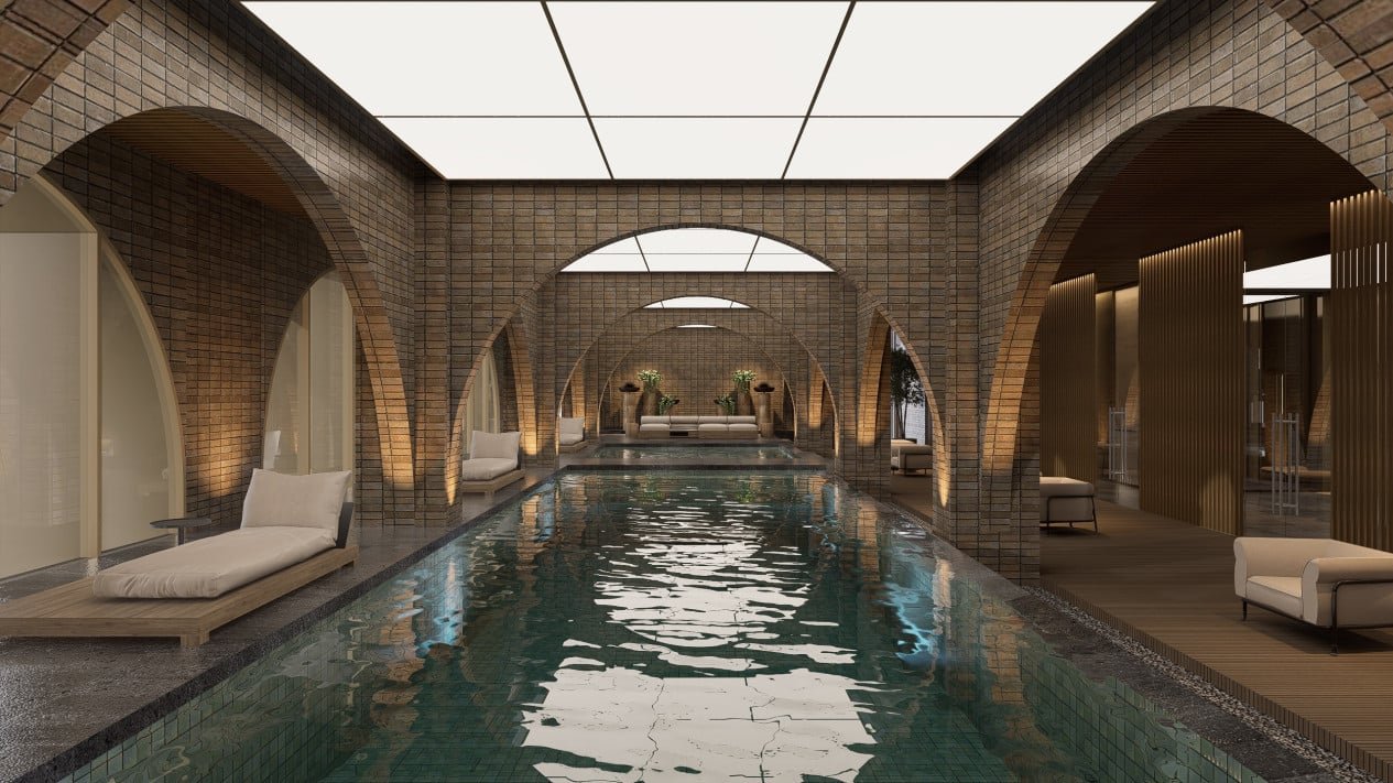 Gli ospiti saranno accolti da un grande ingresso con soffitti alti e pareti curve, creando un’impressione drammatica e suscitando curiosità. Questa sensazione continua nell’area della lobby, che combina mattoni rossi, caldi soffitti in legno e pavimenti in marmo di quarzo bianco, una combinazione che sembra classica ma rimane rilevante per i gusti di oggi.