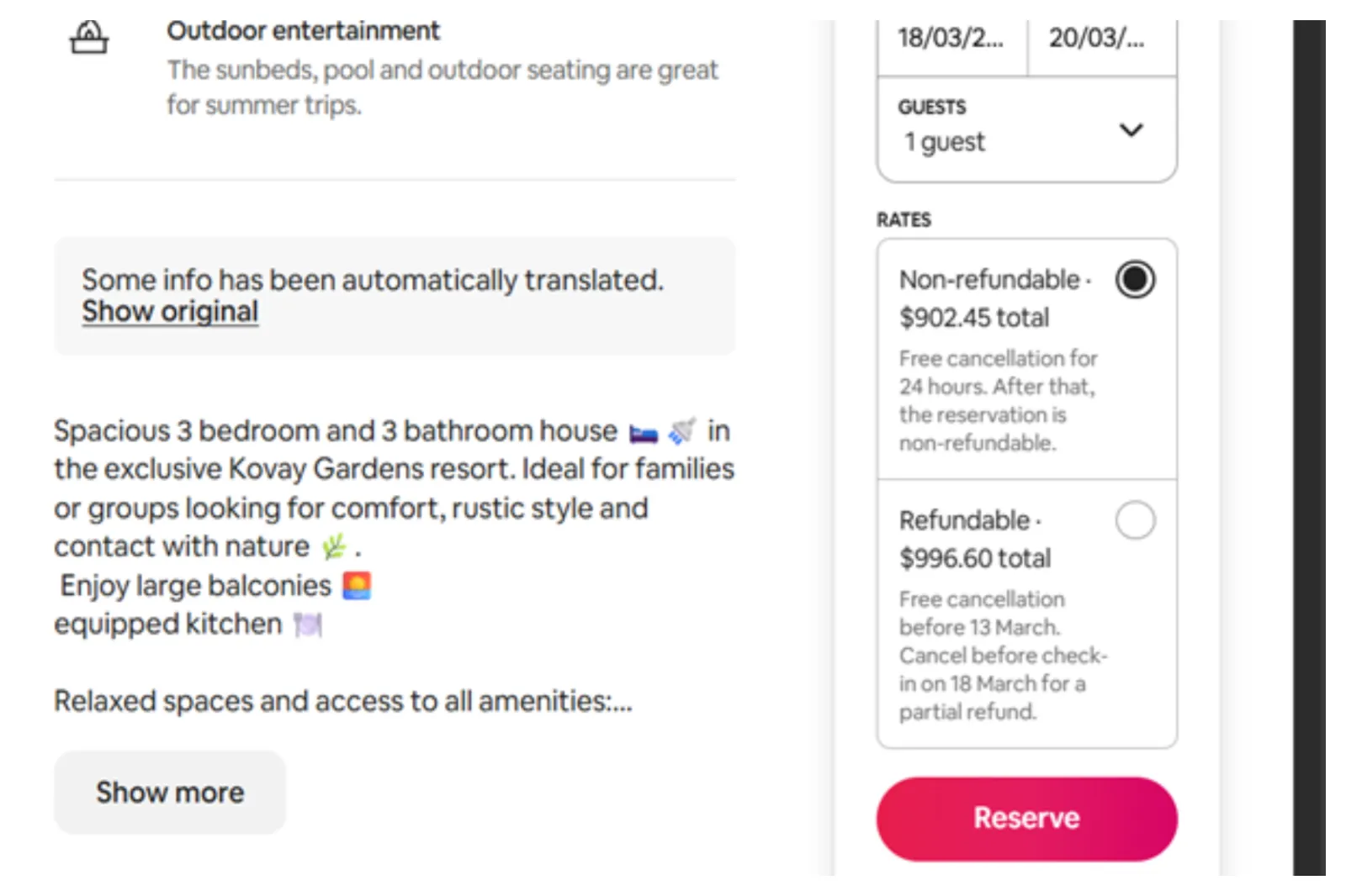“Trova un angolo di paradiso a Kovay Gardens”, dice l’elenco. “All’interno del terreno privato recintato(,) avrai accesso a kayak da mare, moto d’acqua, campi da tennis, piscine, centro fitness, spa completamente attrezzata e un ristorante all’aperto.”