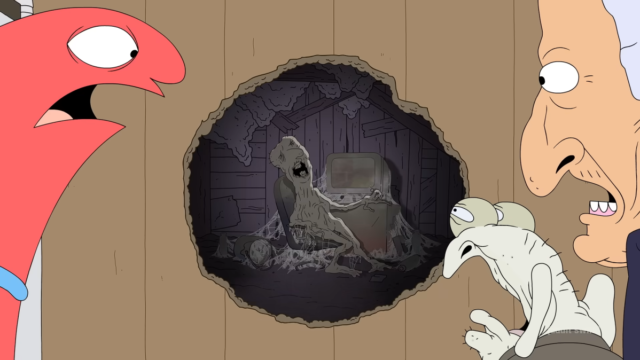 Alan and The Boss from Smiling Friends look through a hole in a wooden wall, revealing a decayed figure in a dark interior space.
