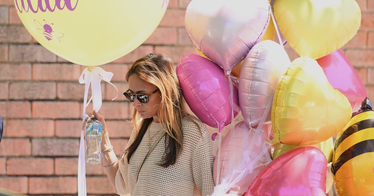 Una donna porta palloncini al funerale di Matilda, 10 anni, vittima di una sparatoria di massa a Bondi Beach, il cui cognome è stato nascosto su richiesta della sua famiglia, a Sydney, giovedì 18 dicembre 2025. (AP Photo/Steve Markham)