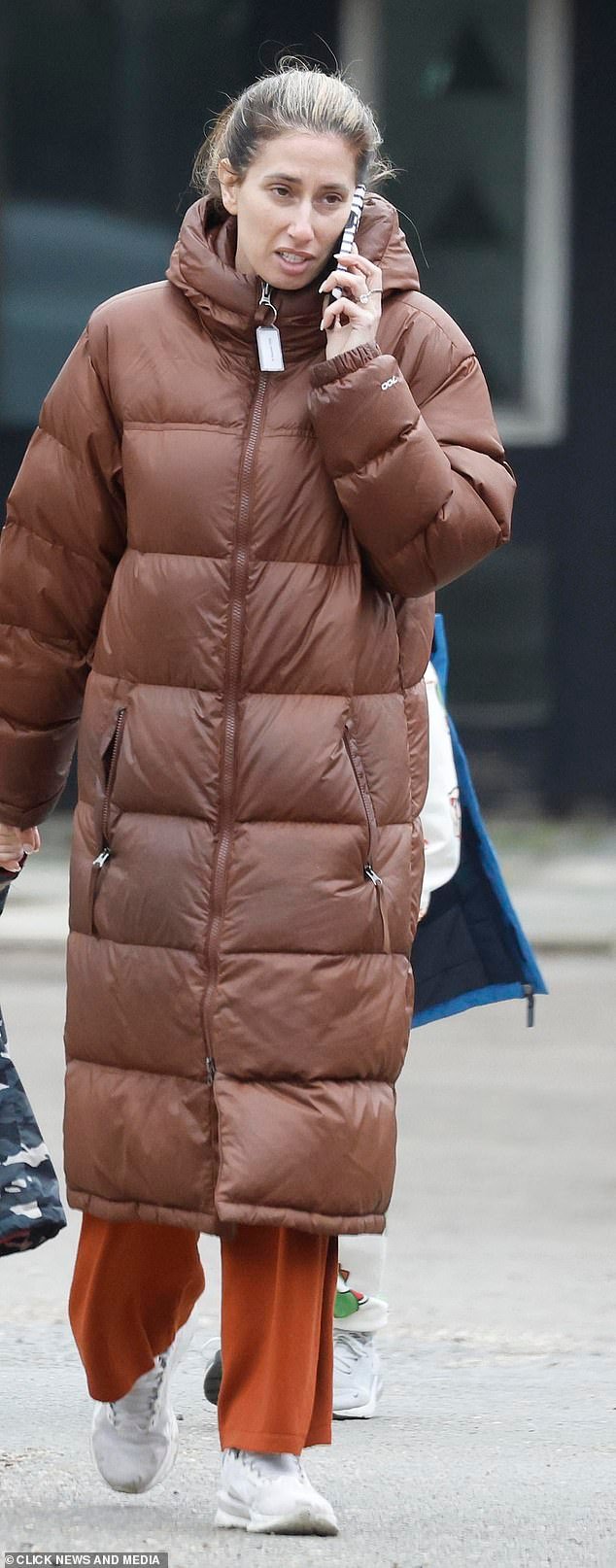 La presentatrice di Sort Your Life Out si è avvolta in una giacca imbottita marrone mentre si è mantenuta casual con un paio di joggers color ruggine e scarpe da ginnastica bianche