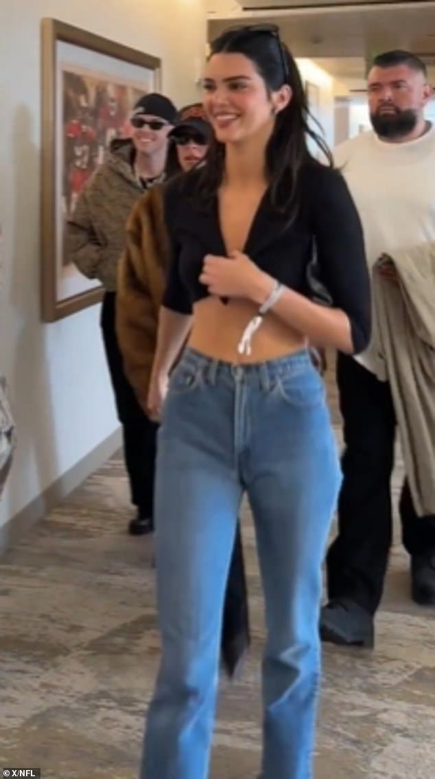 Non nello spirito del Super Bowl! Kendall Jenner è arrivata al grande gioco con un top corto nero che metteva in mostra tutta la sua parte centrale. Ha completato il suo look con un paio di blue jeans a vita alta e occhiali da sole neri