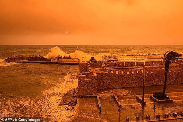 Dall’altra parte di Heraklion, il paesaggio è stato trasformato in qualcosa di simile al Sahara, con uno spesso velo di polvere che oscura quasi completamente il porto.