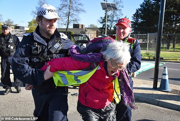 Nella foto: martedì la polizia ha arrestato un manifestante alla RAF Lakenheath nel Suffolk