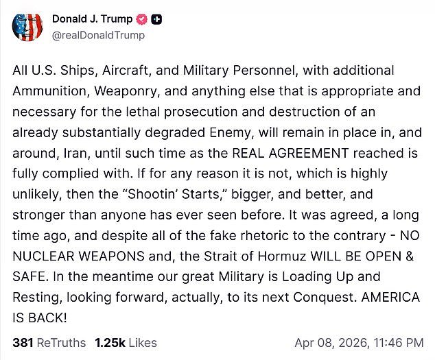 “Tutte le navi, gli aerei e il personale militare degli Stati Uniti, con munizioni aggiuntive, armi e qualsiasi altra cosa appropriata e necessaria per la persecuzione letale e la distruzione di un nemico già sostanzialmente degradato, rimarranno sul posto dentro e intorno all’Iran, fino al momento in cui il VERO ACCORDO non sarà pienamente rispettato”, ha scritto in un post di Truth Social mercoledì sera tardi.