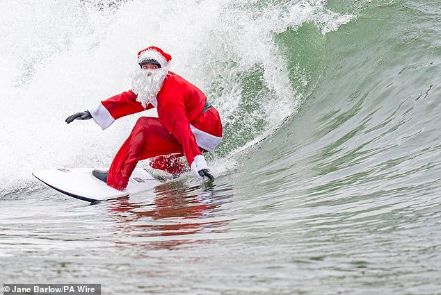 Nel frattempo, l’istruttore e bagnino di Gorebridge Finn Clark è stato avvistato vestito da Babbo Natale durante una sessione di surf al Lost Shores Surf Resort a Newbridge vicino a Edimburgo.