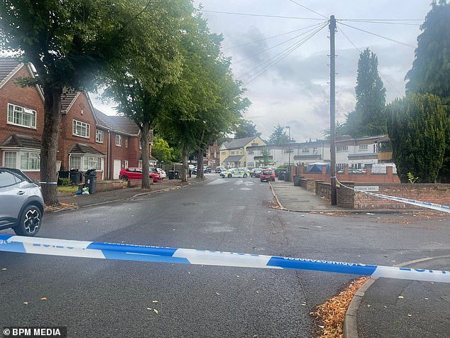 Mahamed Mahamad, 37 anni, avrebbe colpito 29 volte il lavoratore del DPD Aqeef Ali con un enorme coltello seghettato qui in Gibson Road, Handsworth a Birmingham (nella foto: la scena nelle ore successive all’attacco)