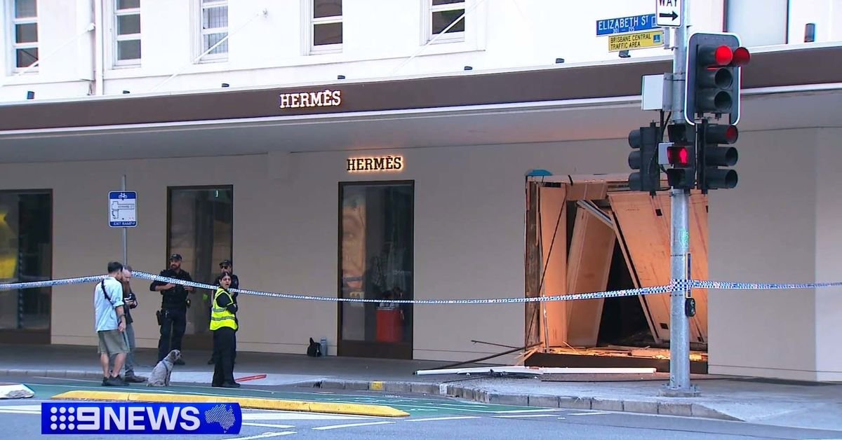 Gli agenti dicono che poco dopo le 3 del mattino, un SUV Mercedes bianco ha fatto irruzione nel negozio Hermes in Edwards Street con i delinquenti che poi sono saltati fuori e hanno rubato borse, gioielli e cappelli per un valore di centinaia di migliaia di dollari.
