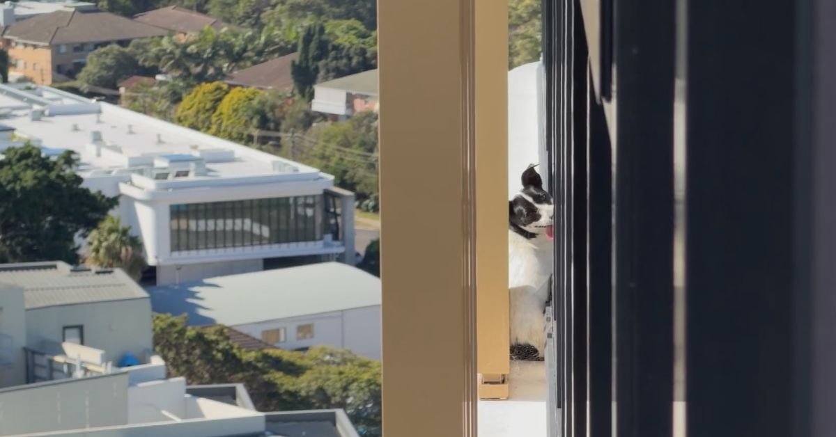 Dopo che i suoi proprietari hanno lanciato l’allarme sui social media, un vicino che pilotava il suo drone ha notato Elbie bloccata tra la ringhiera sul davanzale dall’altra parte del grattacielo subito dopo l’ora di pranzo. (Nove)