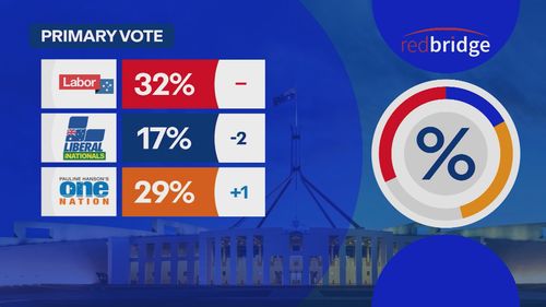 Il crescente sostegno del partito della senatrice Pauline Hanson ha significato un cambiamento per il voto preferito dai due partiti, con i laburisti rispetto a One Nation invece che alla Coalizione nel sondaggio di Redbridge.