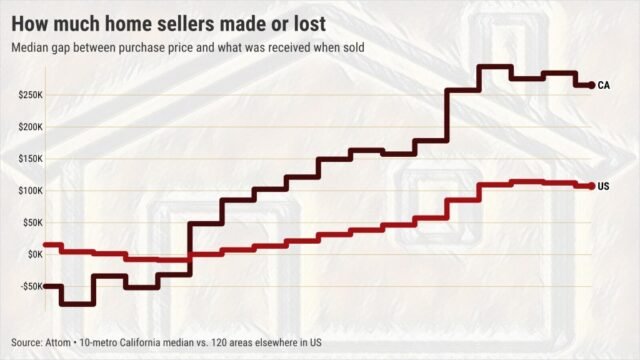 Un venditore californiano del 2025 ha realizzato un guadagno grezzo del 63% rispetto al 50% altrove. Ma dal 2008, la tipica vendita del Golden State ha creato un guadagno del 50%, molto al di sopra del profitto del 20% a livello nazionale.
