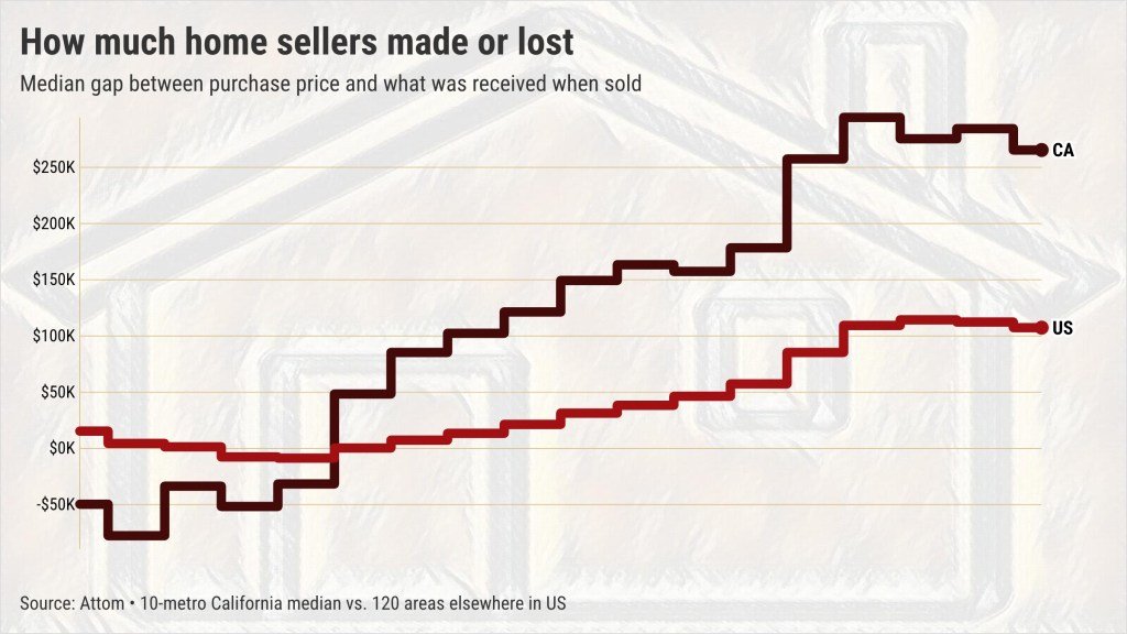 Il tipico californiano ha guadagnato un sacco di soldi acquistando una casa a un prezzo medio di $ 422.000 e vendendola per $ 687.000. Al di fuori del Golden State, si è trattato di un acquisto di $ 215.000 e di una vendita di $ 322.000.