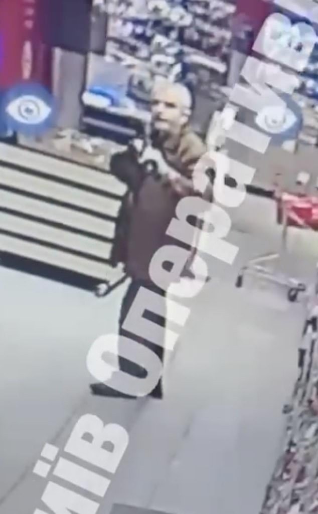 Il filmato dall’interno del supermercato mostrava l’uomo armato, di nome Dmitry Vasylchenkov, 57 anni, nato a Mosca, che brandiva un’arma automatica