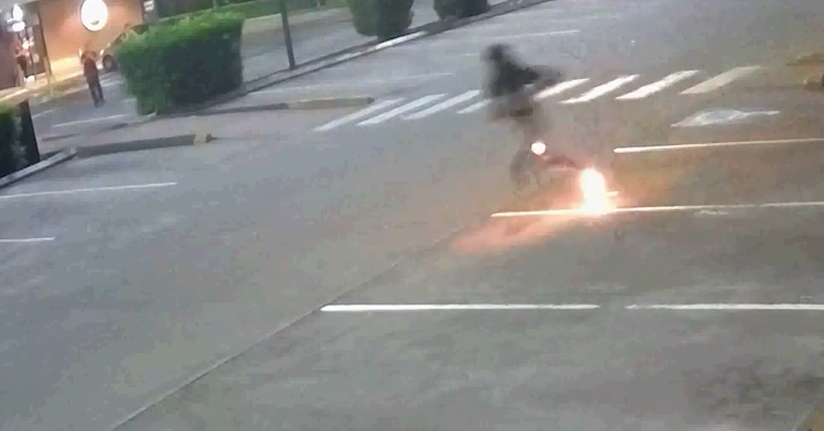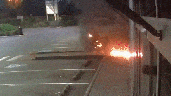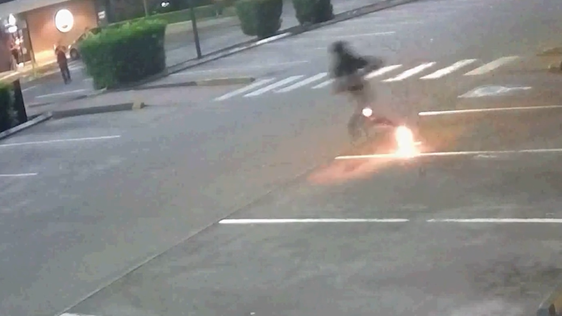 Nel filmato, i due uomini possono essere visti camminare nel parcheggio prima che una palla di fuoco esploda sul marciapiede.