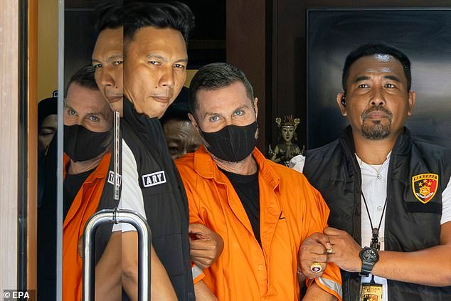 Il fuggitivo, ricercato Spagnaè stato visto scortato oggi attraverso il quartier generale della polizia di Bali a Denpasar da diversi agenti di polizia mentre indossava una tuta arancione brillante e una maschera.