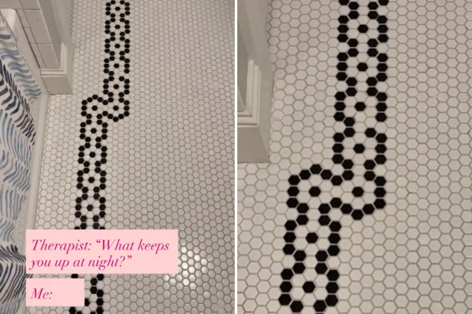 L’immagine mostra un pavimento in piastrelle con motivi in ​​cui una singola piastrella scura appare fuori sequenza, risaltando nettamente rispetto al disegno circostante. Holland ha abbinato l’immagine al testo che recita: “Terapista: ‘Cosa ti tiene sveglio la notte?’ Io”, una didascalia che ha colpito gli spettatori che hanno affermato di non riuscire a smettere di fissare l’errore una volta notato.