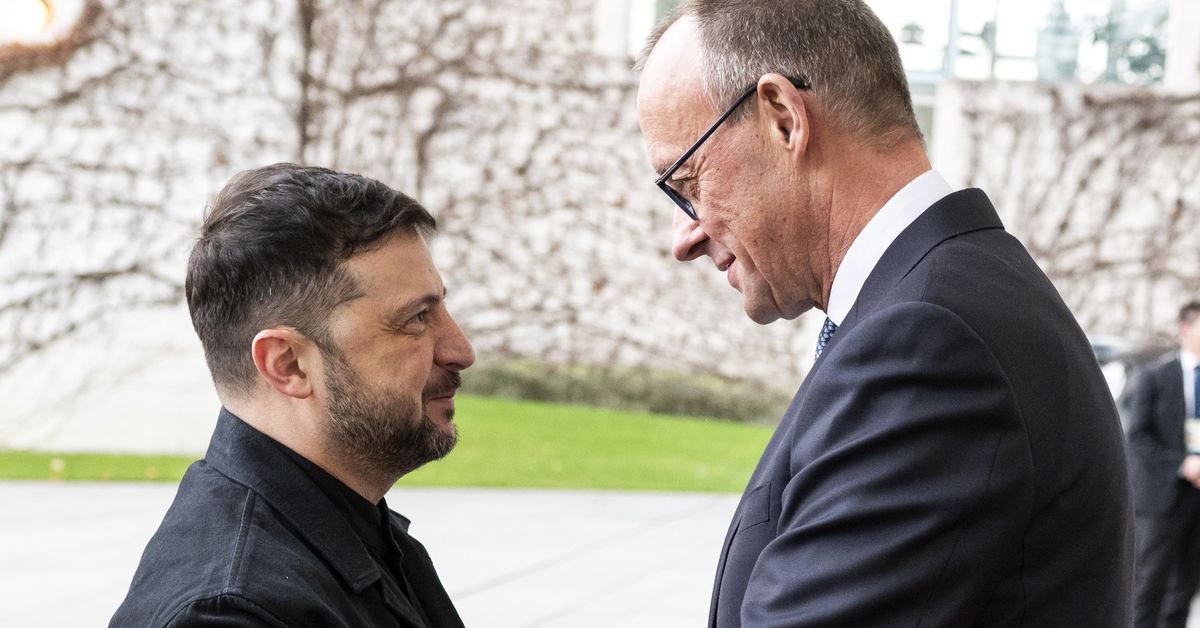 Il presidente ucraino Volodymyr Zelenskyy viene accolto dal cancelliere tedesco Friedrich Merz durante i colloqui ad alto rischio a Berlino. (Governo federale tramite Getty Images)