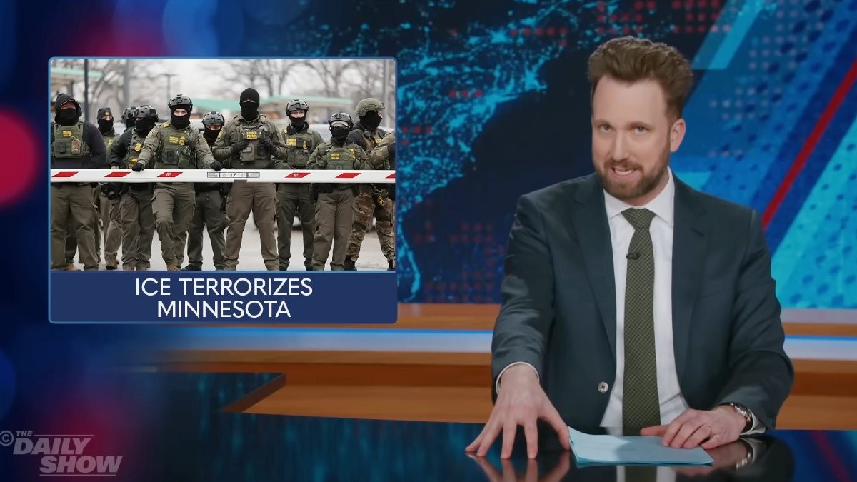 “The Daily Show” ha continuato a trasmettere clip di agenti dell’ICE che rispondevano violentemente alle proteste dei Minnesotani, incluso un video di un uomo che rimane impassibile di fronte a molteplici attacchi con spray al peperoncino. “Porca miseria. Non so cosa sia più terrificante: loro che colpiscono quel ragazzo a bruciapelo con palline di pepe, o lui che non si tira nemmeno indietro”, ha detto Klepper. “Anche se, a essere onesti, ci sono circa 9 gradi là fuori. Lo spray al peperoncino lo sta solo riscaldando.”