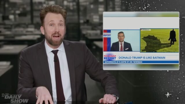 Lo spettacolo Comedy Central ha poi riprodotto una serie di clip in cui Johnson imitava Christian Bale nei panni di Batman e parlava con entusiasmo del successo del 2008, “Il cavaliere oscuro”. Klepper ha anche sottolineato che l’amore del conduttore conservatore per il Caped Crusader era così profondo che ha usato l’intelligenza artificiale per creare un video di lui vestito da supereroe mentre portava fuori gli immigrati in un parcheggio Walmart.